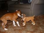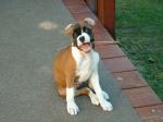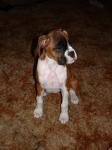 Hello all! Just thought I would give everone an update on Daisy! She is my little escape artist. I took her with me (as I always do) the other day and she does real well with her harness in the car. When we were comming home I had to stop at the store and grab one thing. I was in the store maybe 2 minutes and I come back and there she was sitting in the drivers seat on top of her harness! Not sure how she managed that! Then yesterday when I went to Church I put her in her kennel and of course she barks but I had to go. So when I got back the door was opened and she was sound asleep on her pillow. I frantically checked the whole house and she didn't get into anything ( of course it is puppy proofed pretty good). So now we will be having practice sessions in the kennel while I am at home. haha! She is doing great potty training. A few accidents but mostly my fault for not getting to the door fast enough. It is always in front of the door. She is getting better at the ankle biting. Pants and shoelaces are awful tempting! She is learning the word NO! She was excellant on her little walk this morning. We just go up the block and back, to get her used to the leash. She just threw a little fit this morn then walked right by my side with very little tension if any on the leash. I was very proud! My neighbors daughter is visiting and she has 4 very loud dogs. Daisy was hesitant about walking in front of thier house but on the way back she only glanced at them and kept on walking! She definetly earned her treat!!! Still is a little nervous about the cars going by. (The one corner is very busy) I just put her in a sit and we wait for a few minutes then go back home. She did very good today. She only jumped alittle when a big truck went by, then sat back down. She is doing Great at Sit. We are working on staying. I usually make it in the doorway frist - haha! Took her on her first outing the other day. My sister needed me to take my nephew to his basketball tourney as she had to work and couldn't make the first game. I held Daisy the whole time and she was excellant. No squirming or anything. Lots of people of all ages interacted with her and she was wonderful. We got many many compliments on how beautiful and good she was!!! It was hard not to let her down especially when there were 2 other boxers there! I will be glad when her 3rd series of shots are done so we can learn about the world! I'm sending pics for the 1st time so I hope they are ok. My kids got me the boxer statue for Christmas and Daisy was the same size when we brought her home 2 weeks ago. She is growing leaps and bounds. Sorry this was so long... I am just sooooo Proud! Baccismom Bacci - at the bridge watching over us as always Daisy - Flashy Fawn, Floppy, Docked and Beautiful!