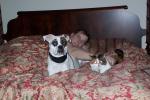 When DH is gone, the The Boys usually sleep with me. Everyone has their specific place on the bed: Zammi at my feet, Tanner next to my shoulders and Pilot by my side. They are all very good when I want more room, all I have to do is say the magic words, "Moose, Moose," and they all move. This is the way my DD at 18 months just to tell our first Girl, Shiva, to move. It stuck with all of our subsequent Boxers! When DH is home they have beds in the bedroom and they have their sofa to sleep on. They just immediately migrate when he's home.