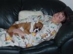 Of course she is invited up in the morning. So here is a pic (don't tell the b/f it's here, not his very best moment) - I've also attached a pic of Voodoo demonstrating how she kicked the b/f out of bed - lol.