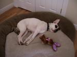 When DH is gone, the The Boys usually sleep with me. Everyone has their specific place on the bed: Zammi at my feet, Tanner next to my shoulders and Pilot by my side. They are all very good when I want more room, all I have to do is say the magic words, "Moose, Moose," and they all move. This is the way my DD at 18 months just to tell our first Girl, Shiva, to move. It stuck with all of our subsequent Boxers! When DH is home they have beds in the bedroom and they have their sofa to sleep on. They just immediately migrate when he's home.